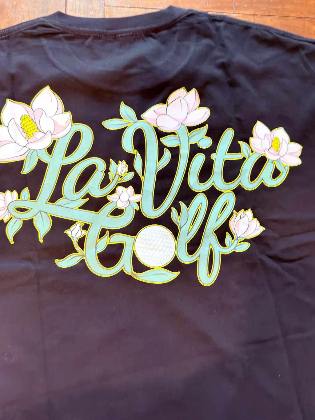The Azalea Tee in navy brings a deeper, more refined take on our signature floral design. Featuring the La Vita Golf script surrounded by detailed azalea artwork, this piece blends timeless golf culture with a clean, modern edge.